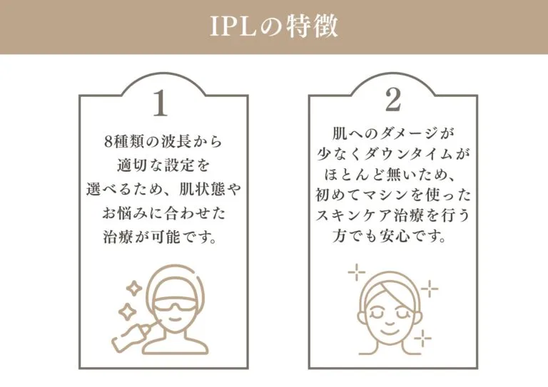 IPL治療とは、Intense Pulse Light(インテンス・パルス・ライト)という、カメラのフラッシュのようなやさしい光を肌に照射することで、肌のエイジングケアを目指す美容医療です。 この光によって生じる熱が肌の内部をやさしく刺激し、コラーゲンを生成する「繊維芽細胞」の働きを活性化させ、肌のキメ・ハリ・ツヤの向上が期待できます。 IPLは紫外線など有害な波長をカットした特殊な光を使用し、シミ・そばかすの原因であるメラニン色素や、赤ら顔の原因となる毛細血管(ヘモグロビン)などに選択的に反応。肌トラブルを改善に導きます。 また、1台で8種類の波長を選べるため、症状に応じて細やかな調整が可能。患者さま一人ひとりに最適な照射が行えます。 ダウンタイムが少なく、施術直後からメイクも可能なので、美容医療が初めての方にもおすすめです。エレクトロポレーションとの併用や、月1回程度の定期的な施術によるメンテナンスとしても多くの方に選ばれています。