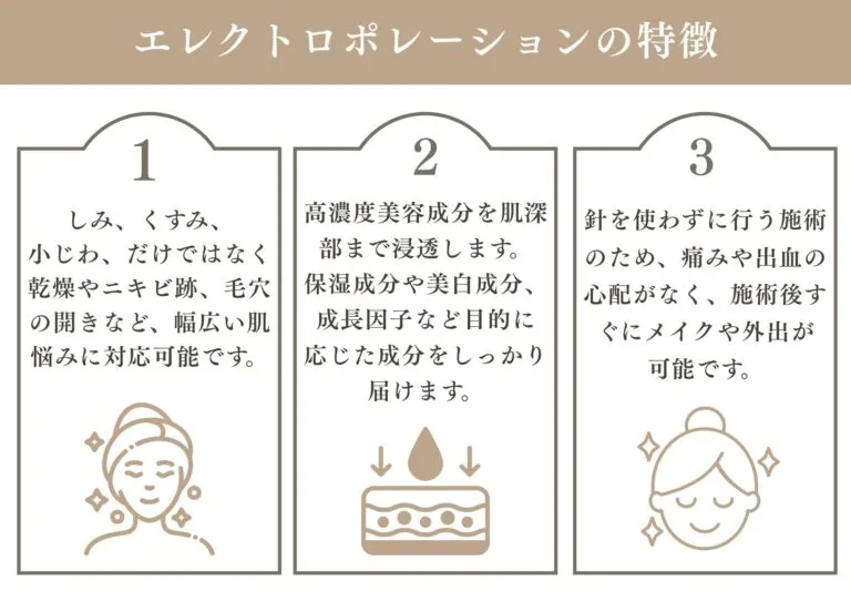 ノーニードルセラピーとも言われます。 通常注射で導入するしか困難だった高分子の美容成分を、特殊な電流を流すことにより、一時的に皮膚に小さな空洞をつくって、真皮層まで導入していきます。通常では浸透しないヒアルロン酸などの成分を、ダイレクトに内部に導入することが可能です。針を使用しないため痛みが少なく、ダウンタイムもほとんどありません。さまざまな肌トラブルに効果的です。 また、当院のスプリングは冷却機能をもったクライオハンドピースを搭載しており、引き締めを行いながら、美容成分を肌の奥まで浸透させます。他の治療法と組み合わせて行うことで、ダウンタイムの軽減などの相乗効果を得る事ができます。
