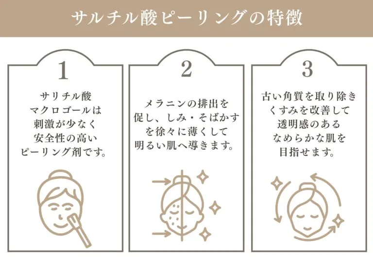 ケミカルピーリングとは、薬剤を用いて、皮膚表面の古い角質を取り除くことにより、肌の新陳代謝を促進し、くすみがとれ、つるっとした透明感のあるお肌へと導く施術です。 当院では、安全性と効果が実証されたサリチル酸マクロゴールを用いています。 サリチル酸は表皮の角質層のみに反応するため、肌が赤くなったり痛くなったりすることがなく、施術後の肌のトラブルもほとんどありません。一度の施術でも効果はご実感していただけますが月1回程度、継続することにより、しみ、小じわなど幅広い症状に効果的です。 定期的なお手入れとしてもおすすめです。エレクトロポレーションを用いたビタミン導入との併用も効果的です。