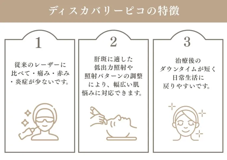 ディスカバリーピコプラスは・532nm・694nm・1,064nmの3つの波長を照射することができ、お肌のお悩みに合わせて照射することができるレーザー治療です。 短時間でレーザーを真皮に届け、正常な皮膚組織へのダメージを最小限に抑えつつ、色素細胞のみに働きかけます。照射後はかさぶたを形成します。2週間後に再診していただき、治療効果を判定します。一部残っている場合は再度照射します。いったんとれたしみですが、とれたあと1ヶ月くらいして再び濃くなる(炎症後色素沈着)ことが多いため、数ヶ月の間、美白剤(ハイドロキノン)とビタミンA誘導体(トレチノイン)を外用していきます。 肝斑は通常のレーザー照射ではかえって悪化させてしまいます。弱いパワーに落としたQスイッチYAGレーザーを回数を重ねて肌に照射していく、レーザートーニングという照射法を用いて照射していきます。最初は週1回を4、5回、その後は様子をみながら2−4週間に一度、total 10回程度の照射を行っていきます。